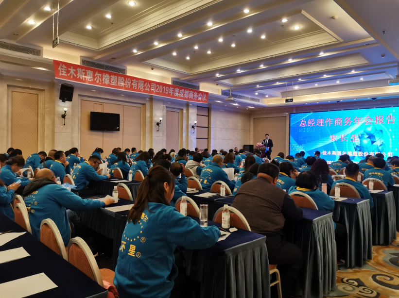 2019年11月25日,值此辭舊迎新之即,佳木斯惠爾橡塑股份有限公司2019-2020年度商務會議在四川成都圓滿召開,來自全國范圍的100多家經(jīng)銷商代表歡聚一堂,共謀發(fā)展。會議總結(jié)了2019年營銷工作,直面矛盾問題,科學預判形勢,就2020年營銷工作進行了部署和落實,會場充滿熱烈喜慶、奮發(fā)向上的氣氛。